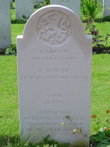 Name: SLOB, ADRIAAN Initials: A Nationality: United Kingdom Rank: Lieutenant Regiment: Grenadier Guards Unit Text: 1st Bn. Date of Death: 23-02-1945 Service No: 306838 Awards: MC Additional information: Son of Mr. and Mrs. A. Slob, of Sneek, Friesland, Holland. Grave/Memorial Reference: 18. A. 4. |