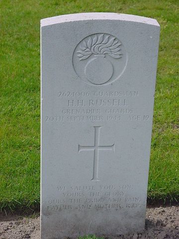Name: RUSSELL, HENRY HALLIDAY Initials: H H Nationality: United Kingdom Rank: Guardsman Regiment: Grenadier Guards Unit Text: 1st Bn. Age: 19 Date of Death: 20-09-1944 Service No: 2624006 Additional information: Son of Thomas and Henrietta Russell, of Llanddulas, Denbighshire. Grave/Memorial Reference: 22. G. 7. |
